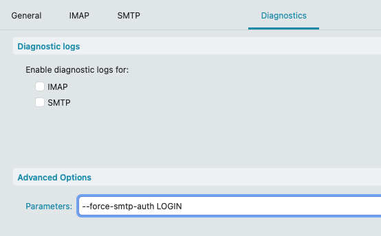 So you normally need to "force the older plain text authentication” allow to send mail. So apart from having the correct SMTP server settings, you need to put in the “diagnostic tab parameters” either of the following.