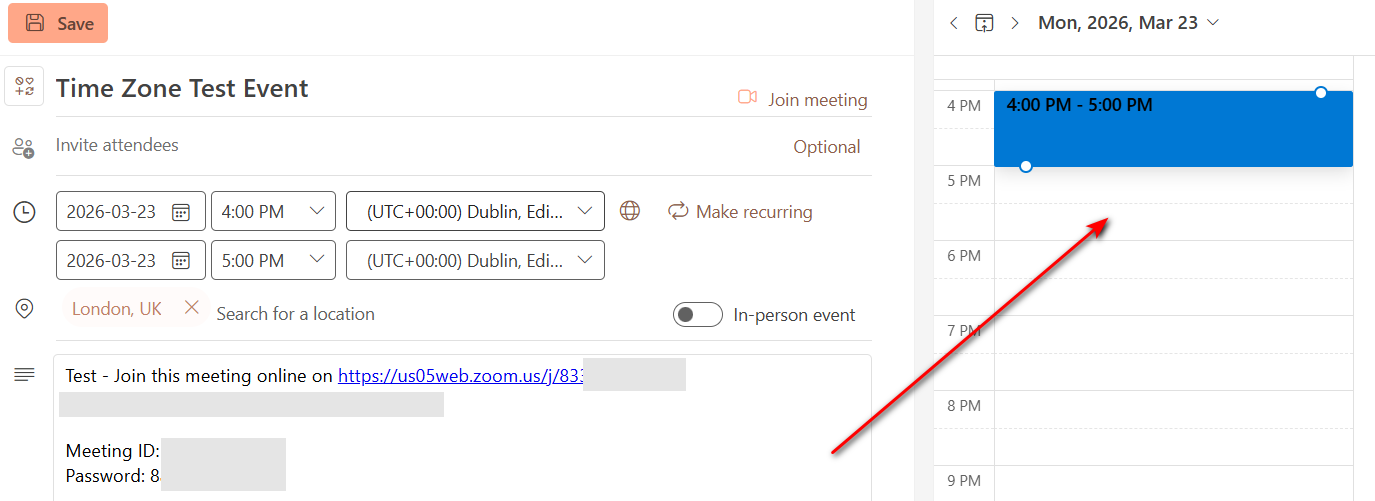 If you create an event at 10am on the eg: 18th March “and you have your correct local country timezone on the right of the start and end time”, then when you save & close the event, you will normally see exactly the same event time back in the calendar view as in the first and second example screenshots below. If that doesn’t save the same time when back in the calendar, then could be your eM Client version might need updating or uninstalling and reinstalling.