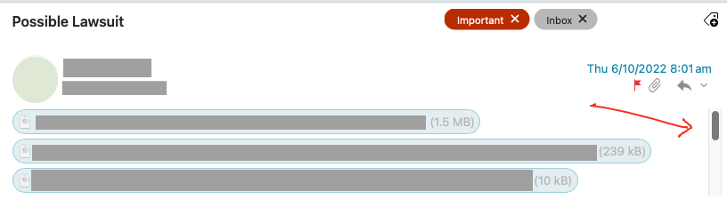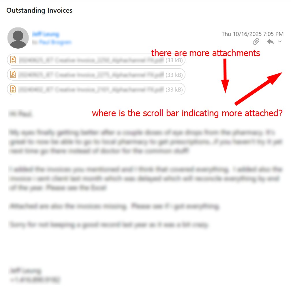 In the upcoming build V10.3.4341 for Pc and Mac “which you can now test via the following forum link”, the attachment scrollbar “is now showing there automatically” on the far right of the attachments “without having to hover over the attachment area” as in my Mac example below.