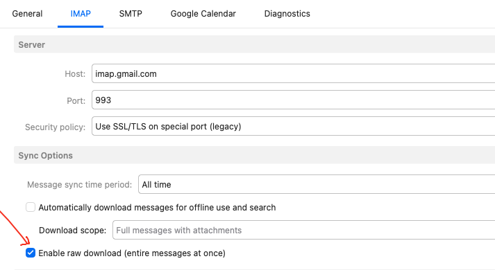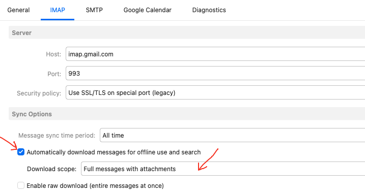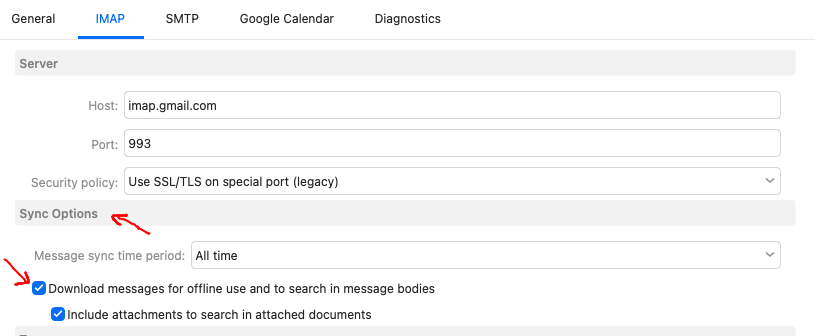 Go to “Menu / Accounts” and click on the “IMAP or Exchange tab” for the account. Scroll down to “Sync Options” and enable the following options as in this Gmail account examples below.