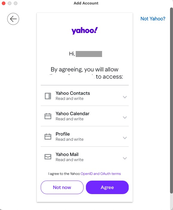 When you run the eM Client setup account wizard, “near the end” for a eg: Yahoo / Sky account, you will see a screen like in the below first example screenshot to then Agree to give eM Client access to your Yahoo mailbox & calendar, contacts etc.