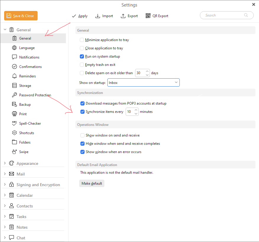 Lastly check via “Menu / Settings / General” how many seconds you have set for sending and receiving as per example screenshot below “to set when the client automatically check for new mail” and syncs new mail to folders apart from when it initially checks after opening the program.