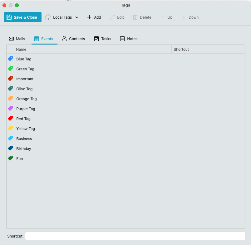So what i do to get the Gmail eM Client Desktop Calendar and Mobile app Calendar the same Tag event Colours, is to first on the desktop, go to “Menu / Tags” and setup all your Calendar Local Event tag colours under Events you want as per the first example screenshot below.