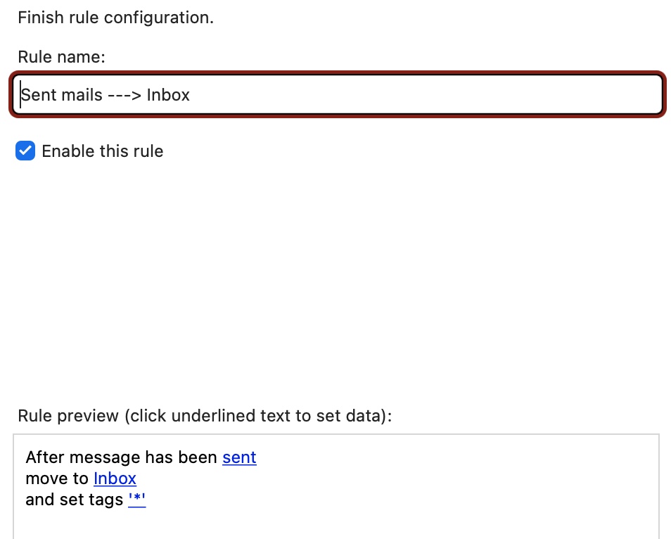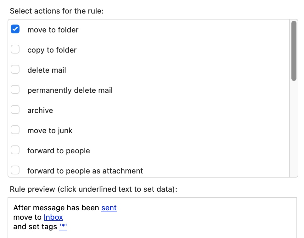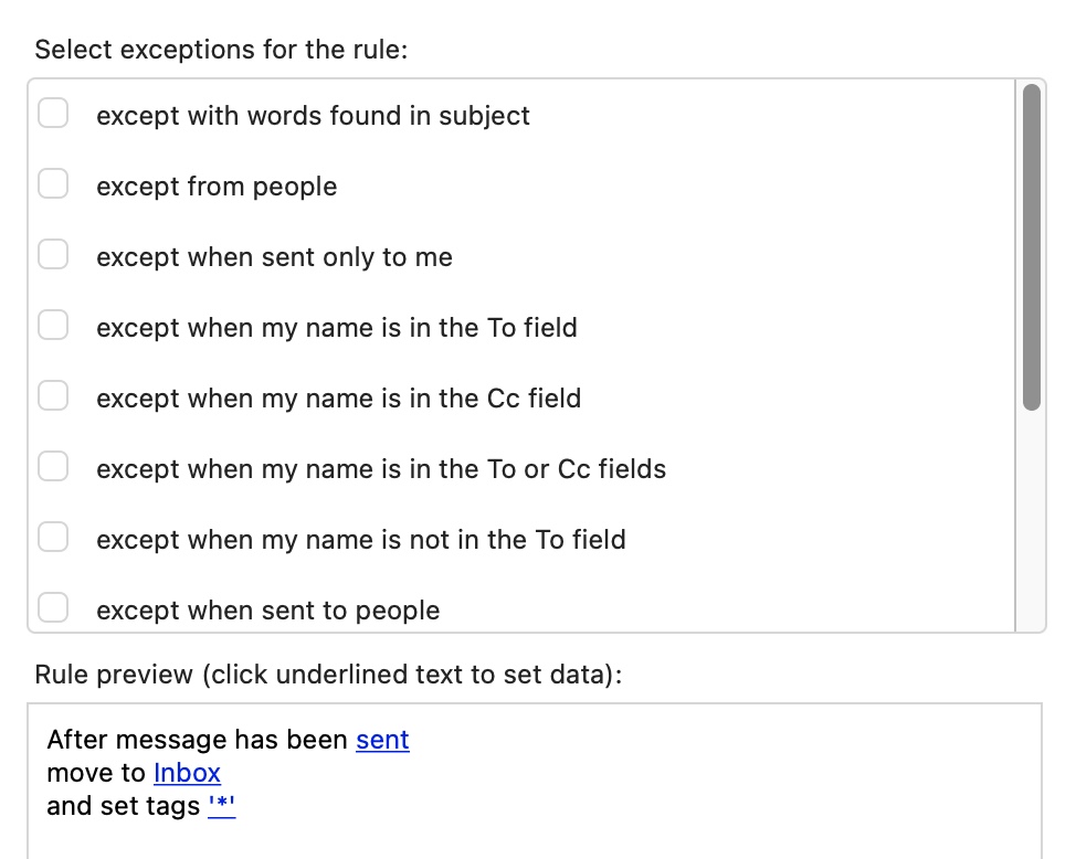 So depends how quickly the sent mail appears as to whether that rule will work automatically.