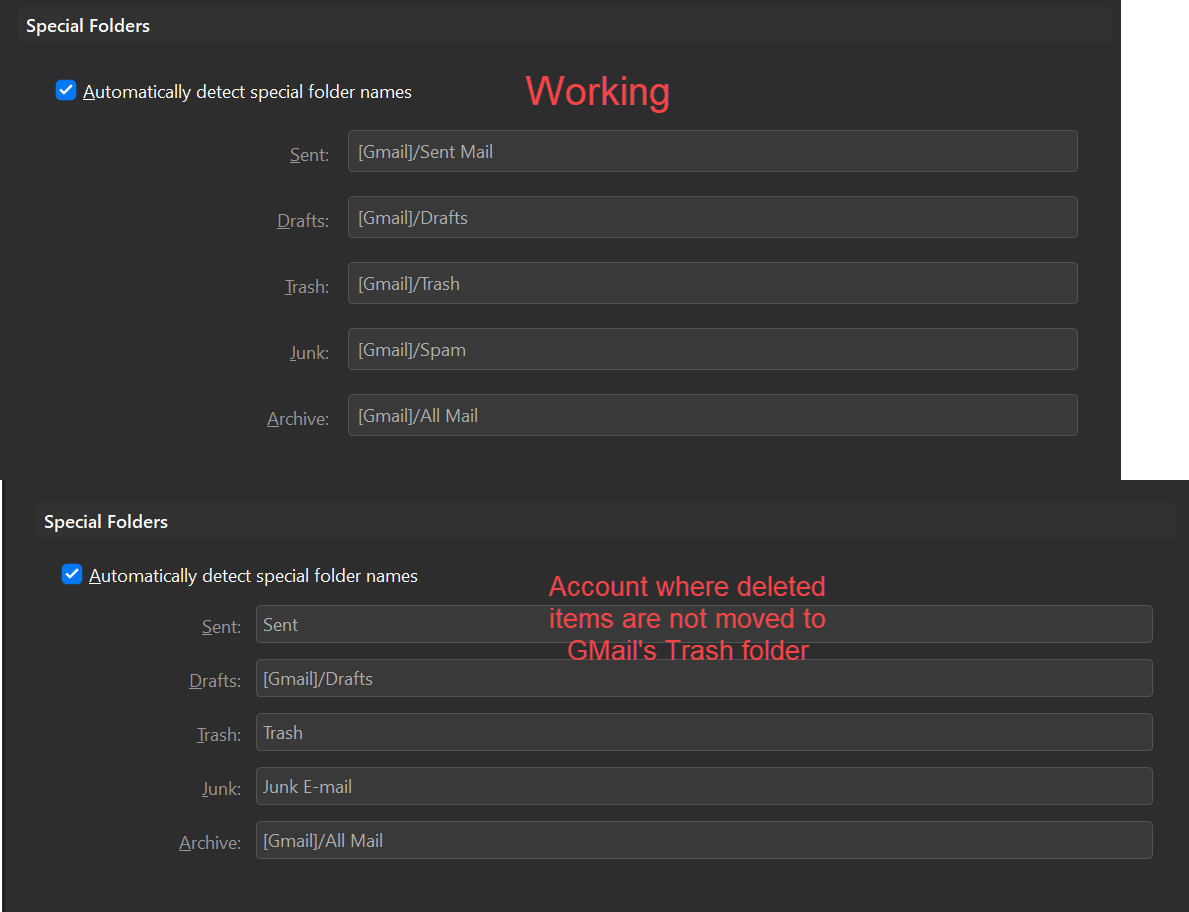 I found some extra labels in my problematic account and removed them. Unfortunately, that did not help. I removed all extra labels from my gmail account and readded the account in EM and these alternate special folder names persist. I canât tell where theyâre coming from.