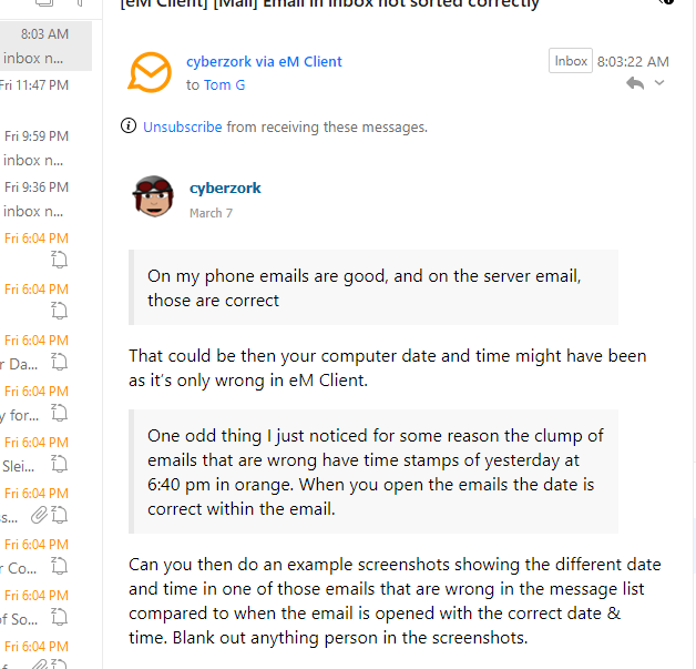 That could be then your eg: computer date and time might have been out or changed locally and affected that as it’s only wrong in eM Client. So dblcheck your computer date and time and computer regional setting to make sure that’s correct just incase it’s possible changed.