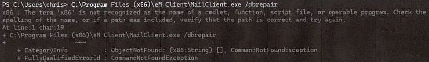 Is this the correct thing to enter? C:\Program Files (x86)\eM Client\MailClient.exe /dbrepair