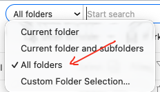 Next if the missing emails are not in a different Category Inbox or you don’t have V10, then “click the dropdown on the far left of the search box” and make sure you are selected on “All Folders” as per the below screenshot.