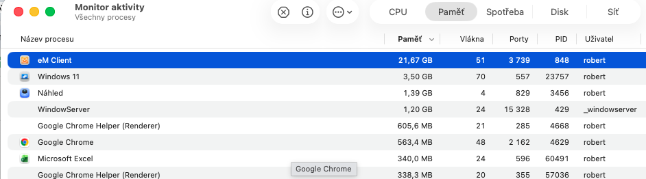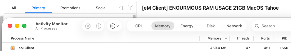 So yes there seems to be some issue with the app “where reopening the app window if its not completely closed first” adds memory usage. even using eM Client V10.4.4924 / OS 26.4