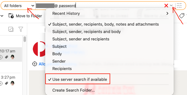 If you have problems again searching with user@ password, first make sure you select “All Folders” and select “Subject, sender, recipient’s etc” if you haven’t already selected those options, and also try “disabling use server search if available” in the dropdown as per below example which speeds up the search time.