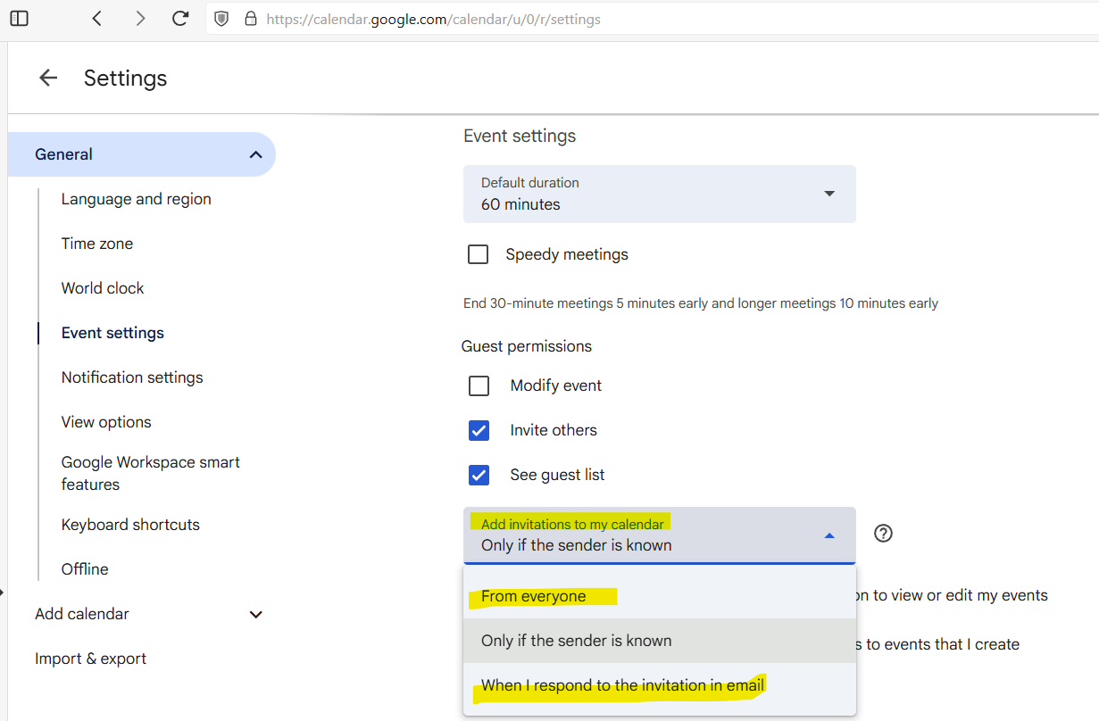 If we set it to “Only if the sender is known” the Android to iOS invitations (do not sync) to Google Calendar online.