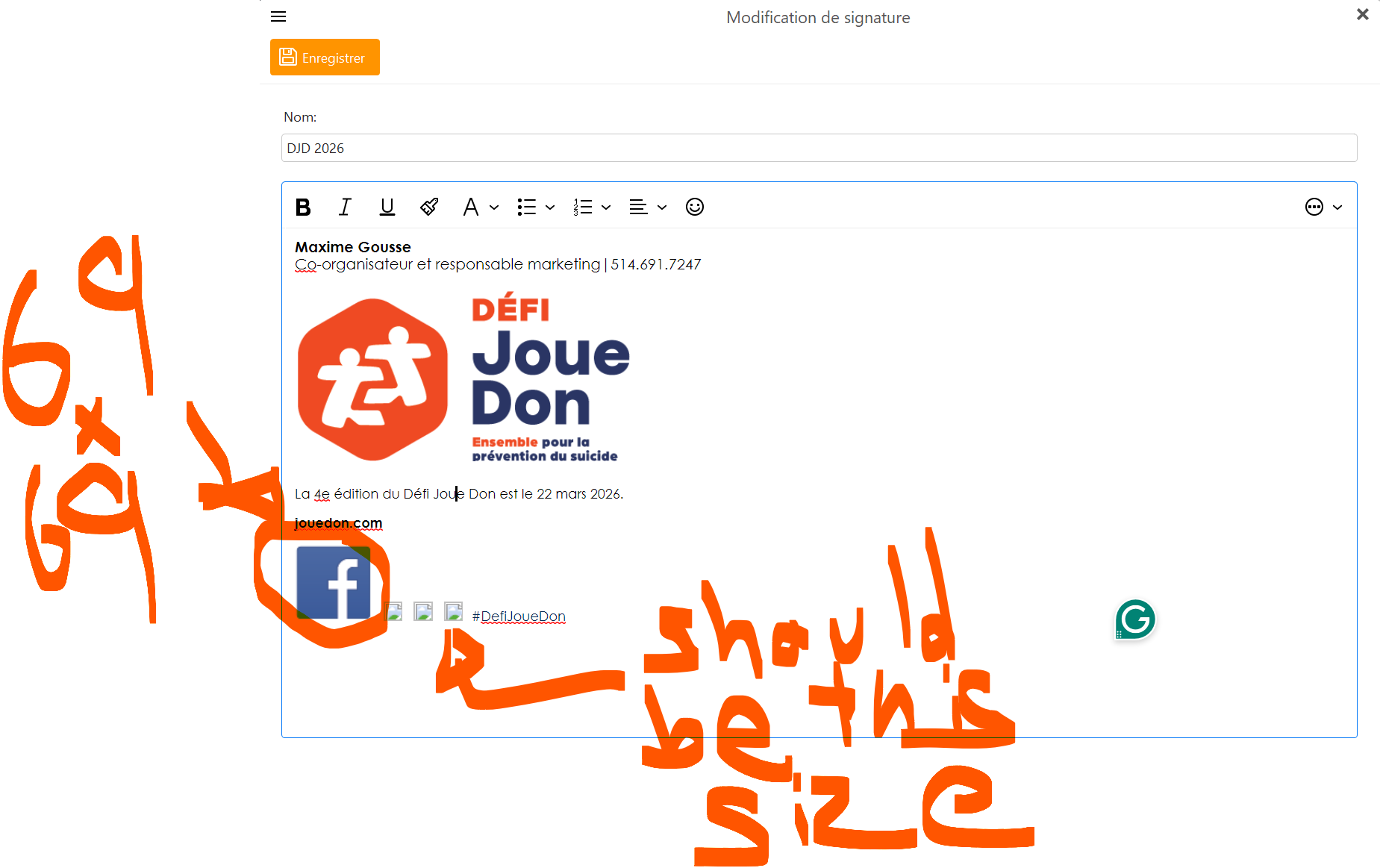 I am trying to create a new signature. Image size in the signature creator is not respected. For example, I have a Facebook logo of 69x69 pixels, yet it appears four times the size.
