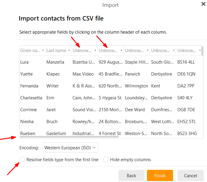 So when you import a .csv file, part way through the import wizard, “make sure to map the columns to the correct fields” by selecting the correct destination field for each column as per this thread post example screenshot below from the following thread on importing .vCard files and .CSV files
