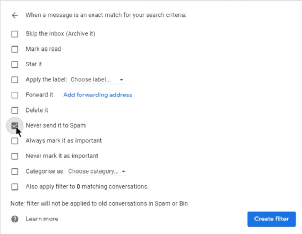 Then click “Create Filter” at the bottom, and then check the box marked “Never send it to Spam” and finally click “Create Filter”.