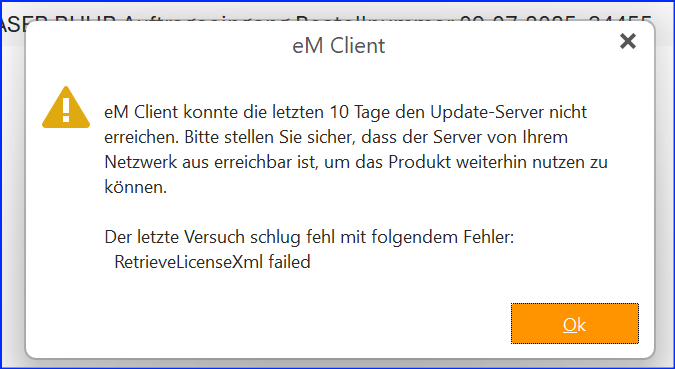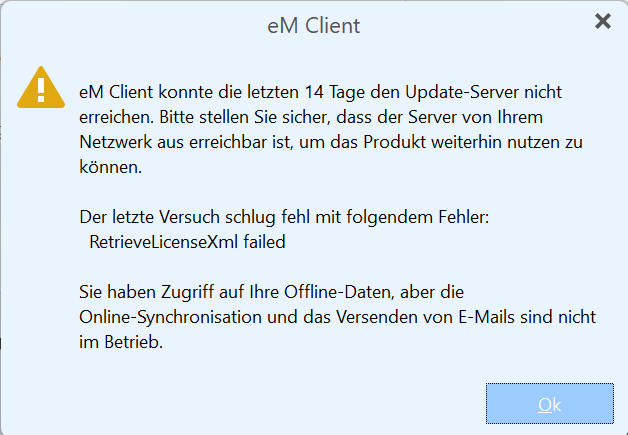 eM Client has been unable to reach the update server for the past 14 days.