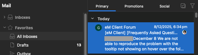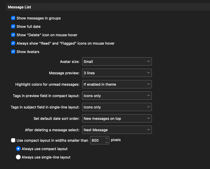 I have emclient set up with 4 POP3 email. Initially set up with default theme and had two lines per new email. Then decided to explore themes and tried Microsoft-Office-Dark entheme as well as trying Microsoft-office-Dark V2 entheme. Shortly after I noticed all mail was coming in with only a single line per email. I tried to fix it in appearance but even when I chose 3 lines, Client displayed the same single line.