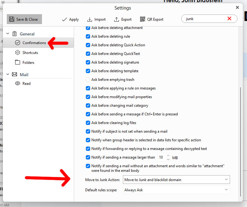 EDIT: I searched the Settings dialog and found a setting under Confirmations. See attached screenshot. However, that does not explain why I’m not seeing what you are seeing clicking in the middle of the Move to Junk button on the Main Toolbar.