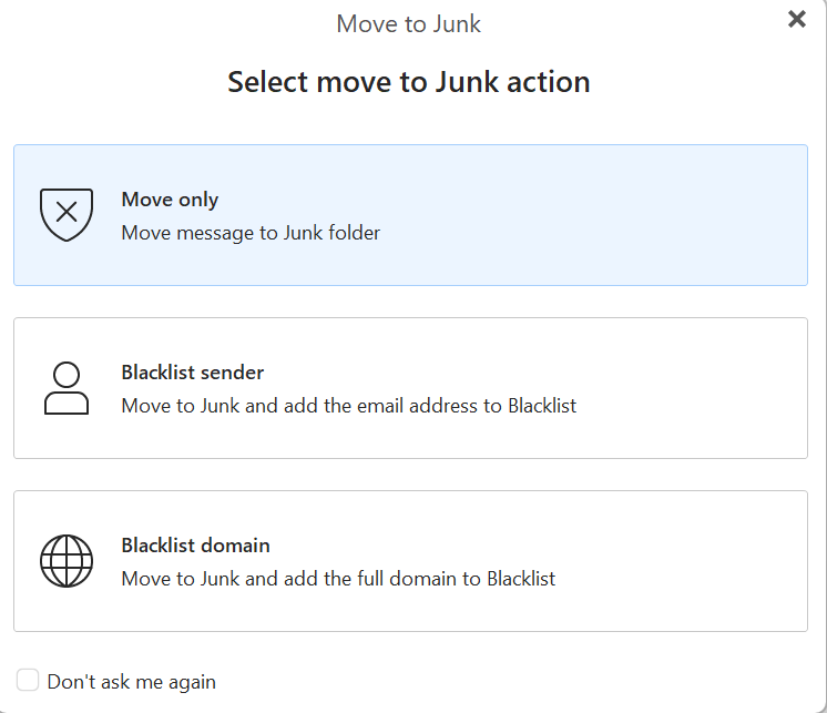 The “Move to Junk” button on the Main Toolbar has three options. I would like to set the default for when the button is clicked–without having to click the down arrow–to “Move To Junk and Blacklist Domain.” I think I’ve seen the option to set the default action, but I can’t find it now. Is there a setting to set this default?