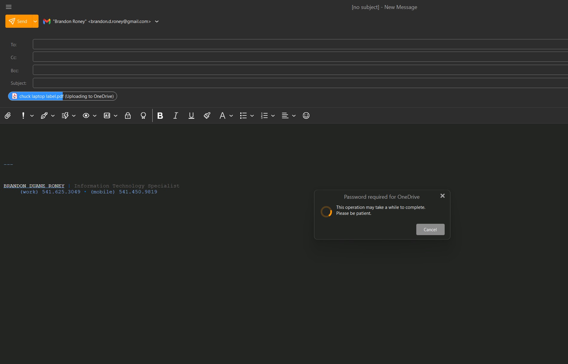 Enclosing a picture showing what is happening. Upon adding an attachment, it goes into an unrecoverable spin operation trying to authenticate to OneDrive – that isn’t even installed on my system.