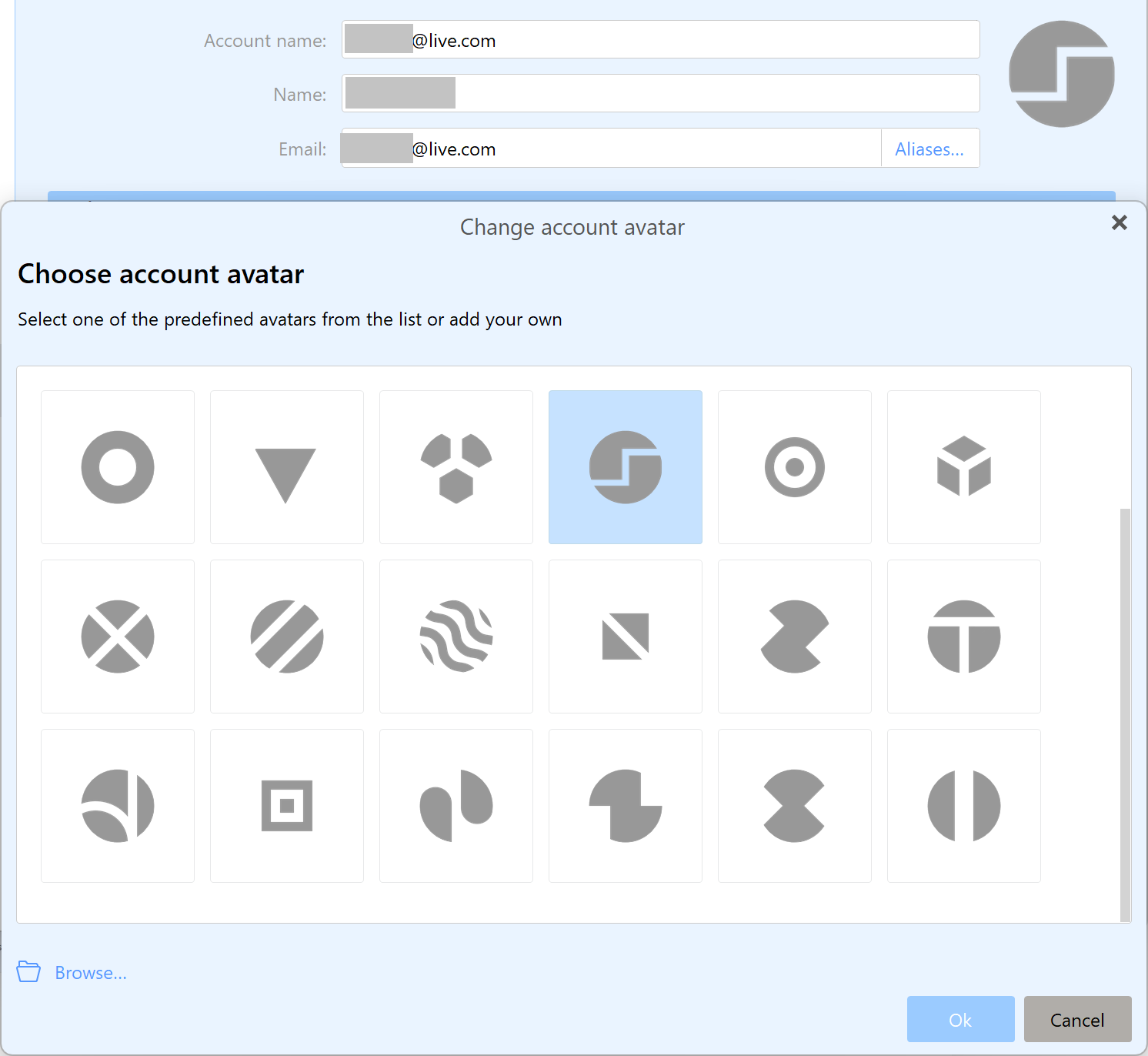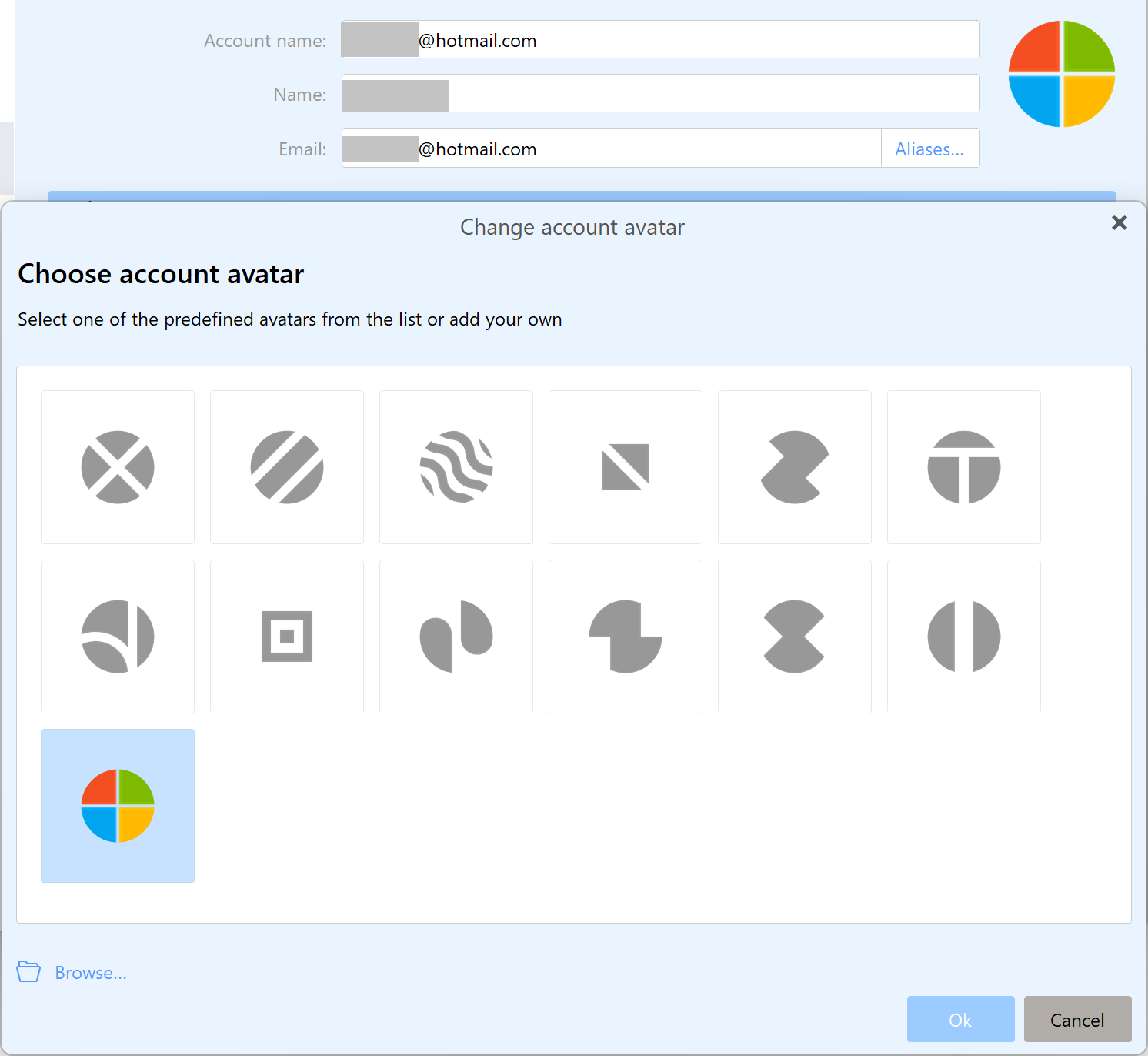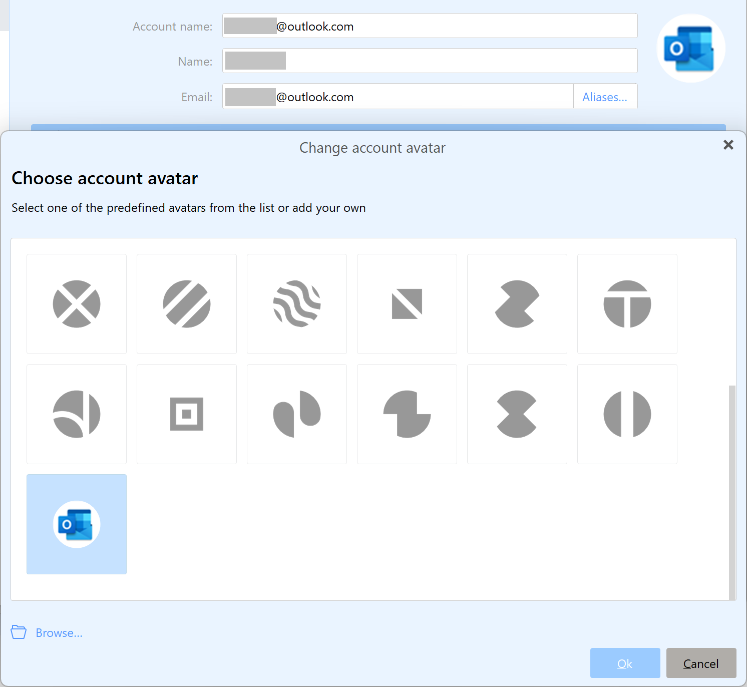 You can change the Live account avatar to have the same Outlook icon or different icon via clicking the word “Browse” after clicking the account avatar icon.