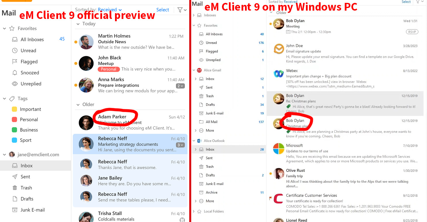 Why does eM Client 9 on my Windows 10 not bold sender names in the inbox like in the official preview? Everything blends together and it’s hard to read. I checked the theme editor but found nothing. Could this be a Windows 10 issue? Would switching to Windows 11 fix the font rendering?