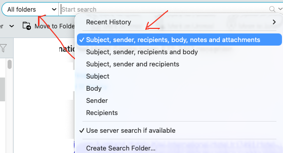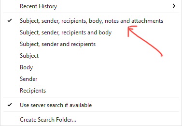 Also when you choose All Folders and search, if you see above the message list âShow Optionsâ as in the screenshot below, click on that and choose the option you want.