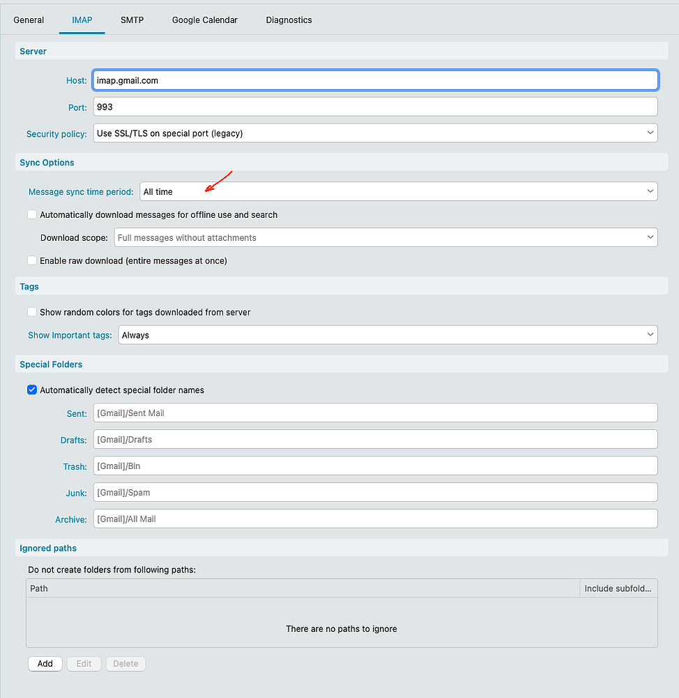 If that is already set, then go online to your Gmail âWebmail / Settings / Forwarding and POP/IMAPâ section, and check if you have set the default âDo not limit the number of messages in an IMAP folderâ as in the second example screenshot below.