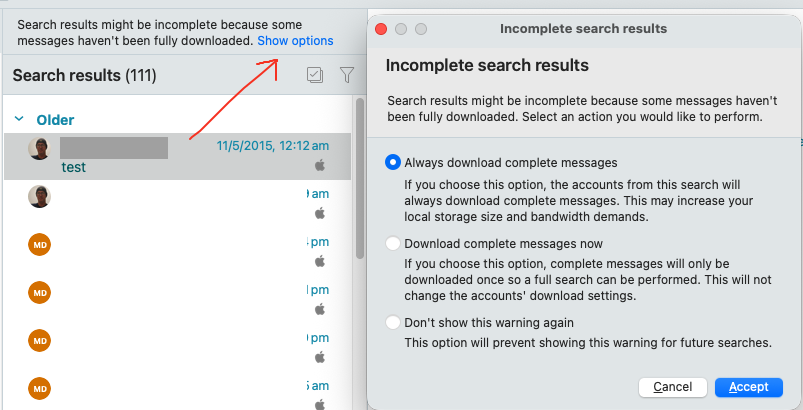 As some account messages in the search results âmay not all appear straight awayâ and be incomplete âuntil all fully downloadedâ.