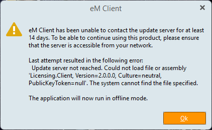 “eM Client needs to periodically contact the license server to validate your license. If you have a firewall or VPN that is blocking the connection, then eM Client will eventually be disabled”.