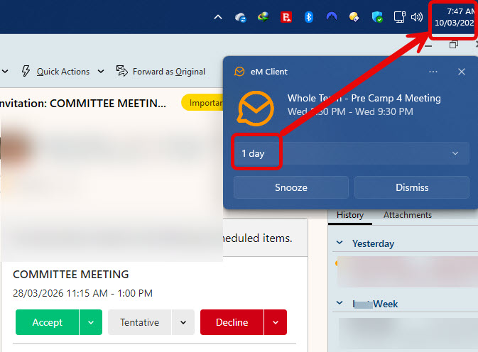 When selection a meeting notification to snooze for a day, emclient does not work - it snoozes for 10 mins only -