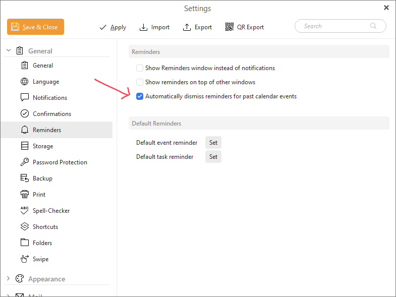 Check you have dismiss reminders for past calendar events checked via “Menu / Settings (Preferences) / General / Reminders”.