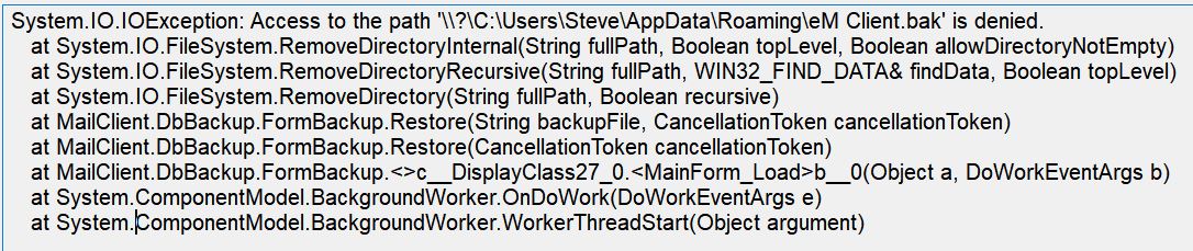 From the error it’s saying your Access to path eM Client hidden folder .back file etc is denied.