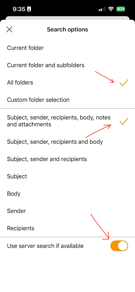 Then first make sure you have selected “All Folders” and selected “Subject, sender, recipients, body, notes and attachments” as per screenshot examples below.