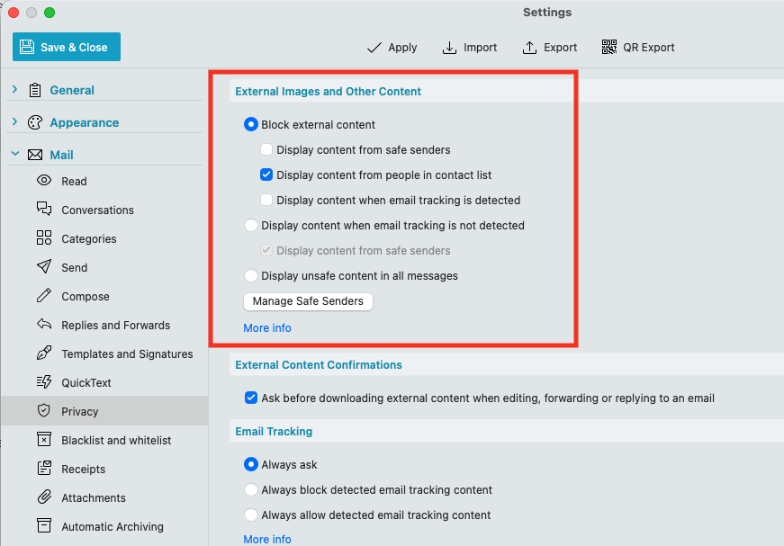 You can control whether the mail client accesses any senders email content via going to “Menu / Settings (Preferances) / Mail / Privacy” where by default eM Client blocks external content.