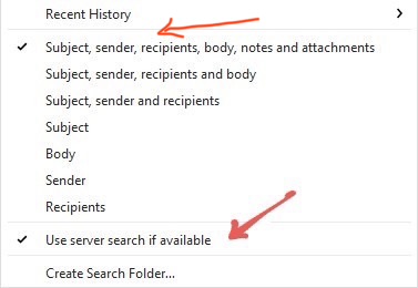 Next make sure the search is checked on "Subjects, Sender, Recipients, Body, Notes and Attachments near the top of the search option.