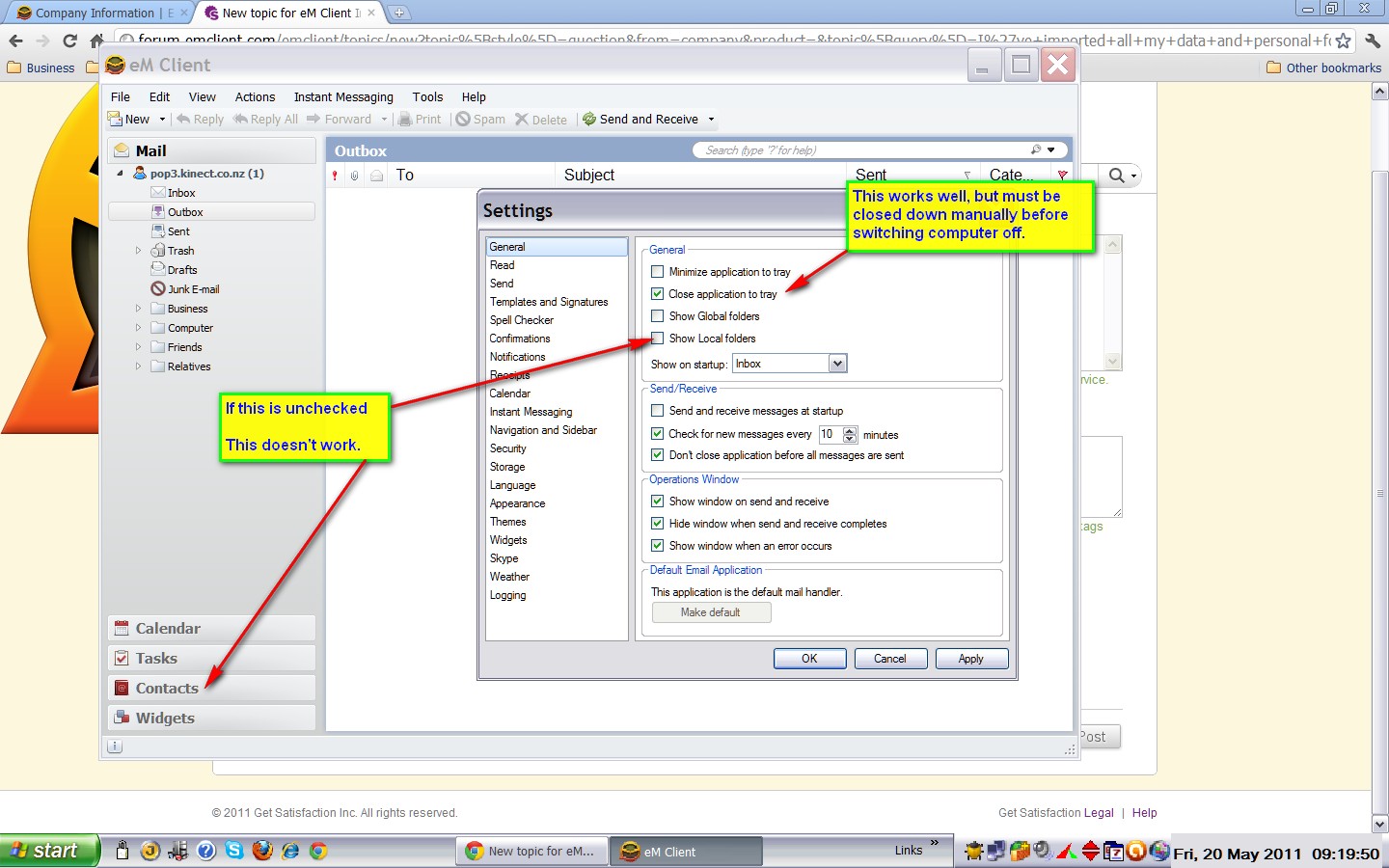 My XP system will not close down at all now unless I right-click the eM Client icon in the Tray and select “Exit”. After doing this and rebooting I get the the Database check again. All is okay if I don’t have this setting ticked, but I like the instantaneous opening of eM Client this setting offers.