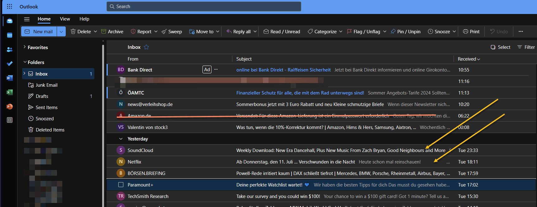 new messages on my Outlook accounts will not be shown in the Inbox, but the counter shows e.g. +1,