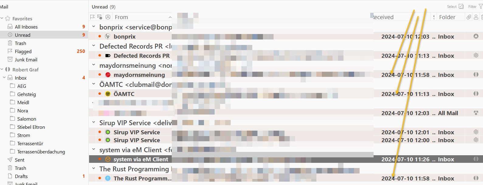 Enclosed 3 screen shots from the Favorits/Unread ⌠which shows âInboxâ but are not in Inbox of the account, and one from outlook.com where you can see at least 2 emails not shown in eM client Inbox.