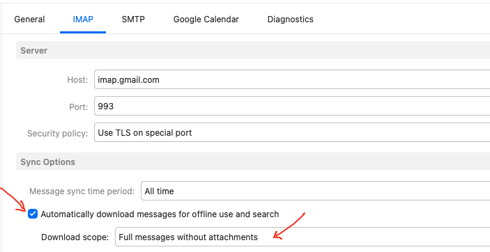 Go to “Menu / Accounts” and click on the Gmail “IMAP tab” for the account. Scroll down to “Sync Options” and enable the following options as in this Gmail account examples below.