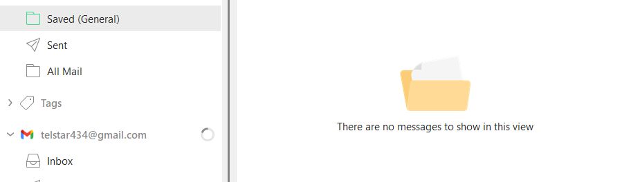 I’ve been using eM Client for a number of years and been pleased with its performance and features. However, over the last few weeks, it has intermittently become so slow at downloading my gmails and this now seems to have become a permanent problem, rendering the program virtually unusable. I have tried repairing the program and reinstalling it, but it hasn’t made any difference. Also, the same problem is occurring on my other laptop and also on my Samsung Android phone. I’ve tried using other email apps (Outlook, Outlook Classic, Thunderbird and The Bat!), and they don’t have this problem. In addition, I have just checked in my All Mail folder and found a message with the label “Saved (General)”, but when I checked the the Saved (General) folder, there’s nothing there and the spinning icon is still showing on my account (see screenshots).
