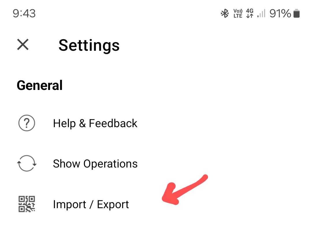Thanks a lot. On my mobile app (version 10.0.2081) I only get the “Importar mediante códio QR”, taht is Import via QR code. There’s no export option and obviously not an option to export to file or via QR. The “Importar mediante código QR” option opens my camera directly.