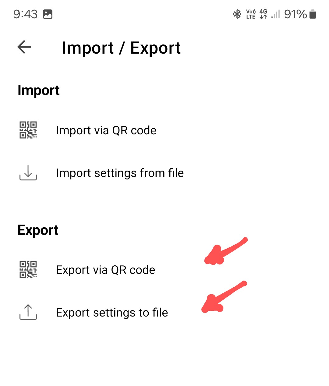 Then under “Export” press either “Export via QR Code” or “Export settings to a file”.