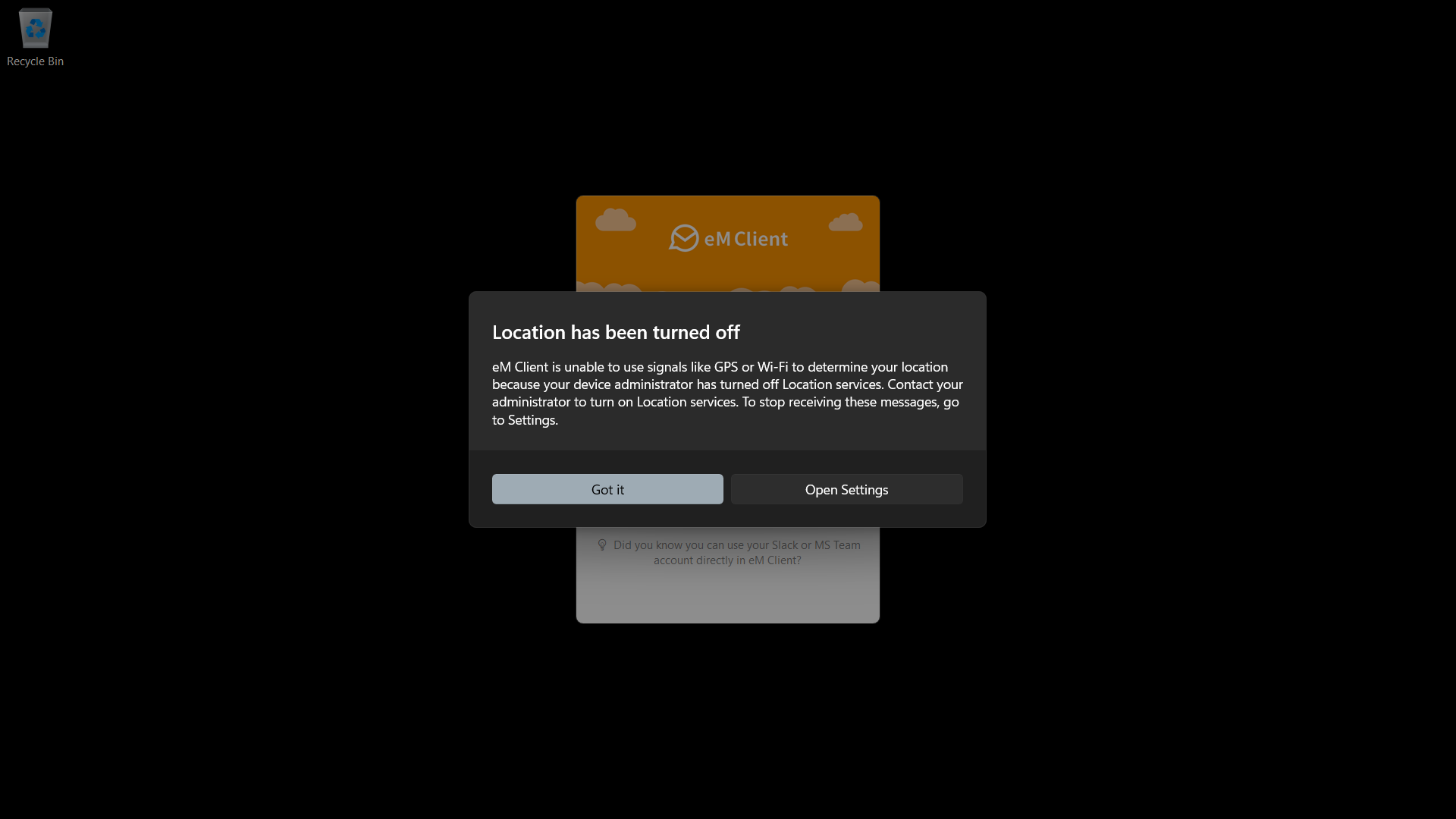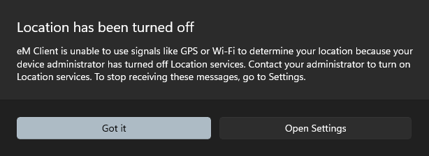 “eM Client is unable to use signals like GPS or Wi-Fi to determine your location because your device administrator has turned off Location services.”
