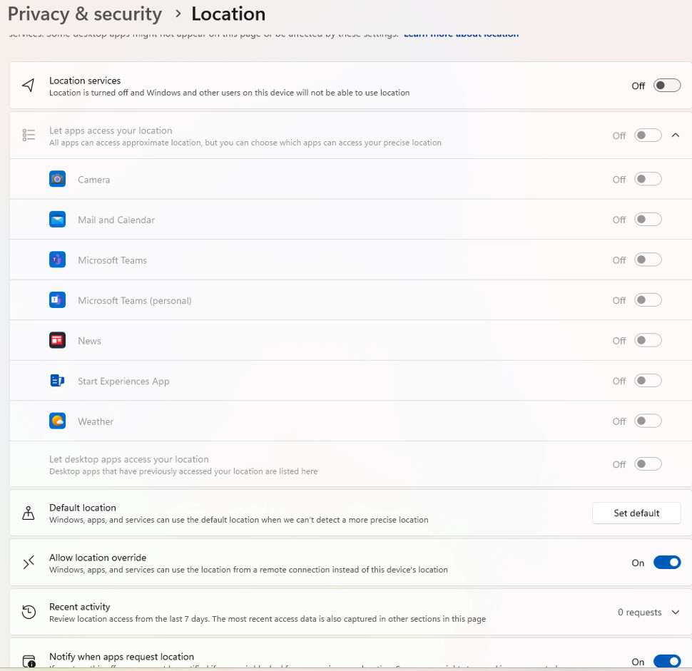 The computer is configured so that all apps are blocked from accessing device location services, therefore the following message is displayed on Windows 11 25H2.