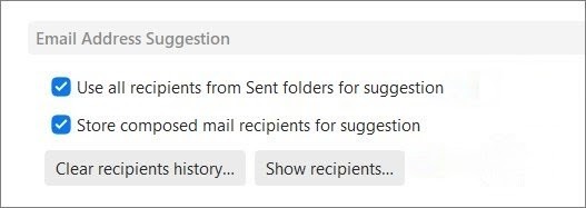 Next if that email address is not showing in the recipient history and even clearing the recipient history is still being automatically suggested, then “uncheck use all recipients from the sent folder” and click Apply & Save Settings" and the close and reopen eM Client and type a few letter of that recipient in the To:,Cc,Bcc line and see if it still appears. You will then know if it’s coming from your sent mail folder emails.